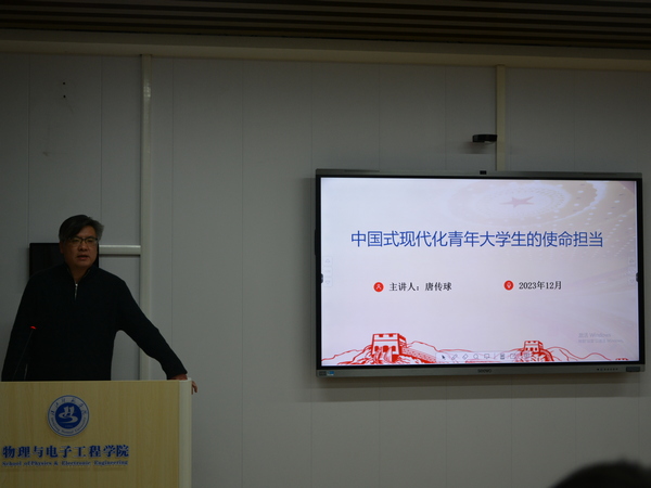 开班式结束后,唐传球以“中国式现代化青年老员工的责任与担当”为题开展本次培训班第一讲,他从“中国式现代化”的历史逻辑、“中国式现代化”的理论内涵、实现“中国式现代化”必须牢牢把握的的准则等三个方面,为同学们讲述了中国式现代化与新时代青年的责任担当,引导广大同学要坚定信念,勇于担当,埋头苦干,矢志奋斗,在实现中国式现代化的征程上书写最美青春华章!