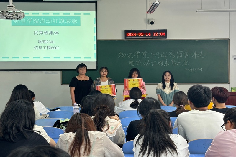 自律委员会和员工会的员工干部对4月查寝、早晚自习以及教室卫生等方面情况进行了总结,指出了存在的问题,提出了改进建议与要求。最终,夏荷楼725等6个宿舍荣获4月“优秀文明宿舍”称号,物理2301和信息工程2202荣获“优秀班集体”称号,与会老师为先进集体颁发了奖状并合影留念。