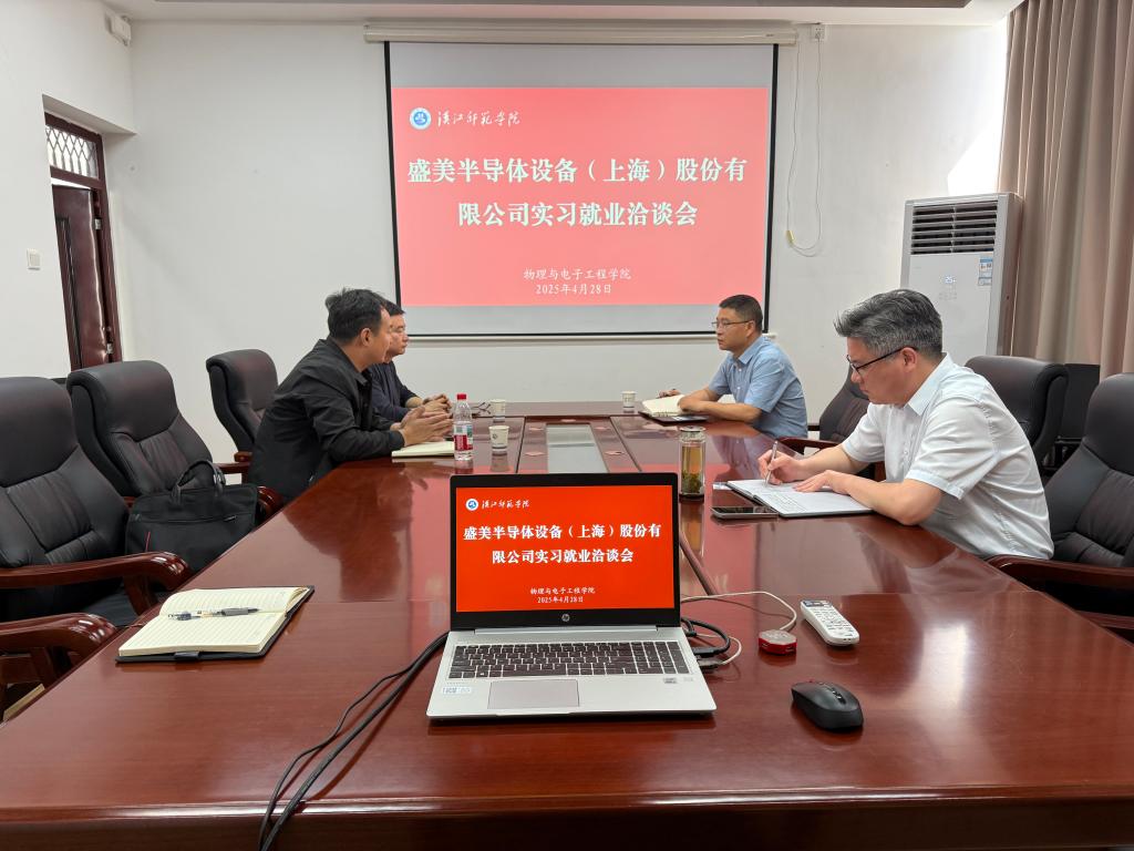 4月28日上午,盛美半导体设备(上海)股份有限公司到访公司,就实习就业相关工作进行洽谈。公司分党委书记唐传球、副经理刘锋、副书记戴俊和辅导员贺培参加会议。